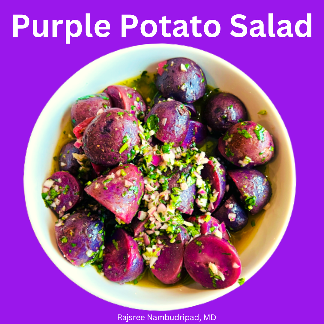 Purple potatoes are a rich source of the special “dark purple antioxidant” called anthocyanins! They have resistant starches and good fiber for the bacteria in your microbiome. They are lower glycemic index compared to traditional potatoes. They are also a great source of potassium, vitamin C, and trace minerals like selenium. The dressing in the recipe is also loaded in antioxidant, anti-inflammatory, and detoxifying ingredients!